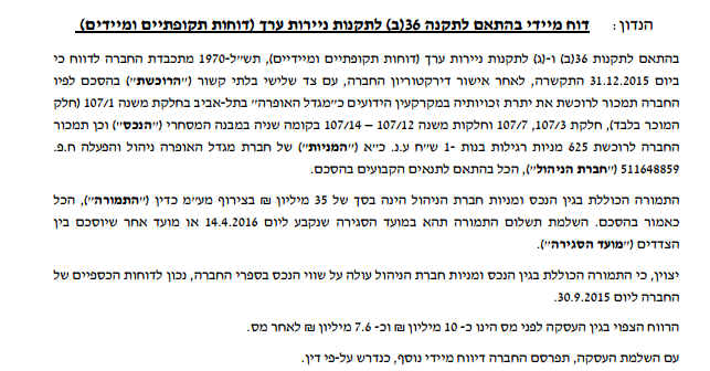 אדרי-אל ישראל נכסים בע"מ תמכור את יתרת זכויותיה במגדל האופרה בתל-אביב ומניות של חברת הניהול והאחזקה תמורת 35 מיליון ₪.