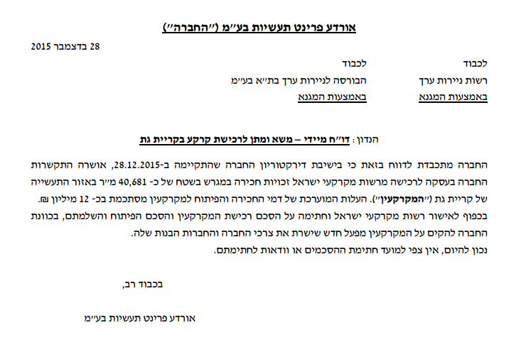 אורדע פרינט התקשרה בהסכם לרכישת קרקע בקריית גת