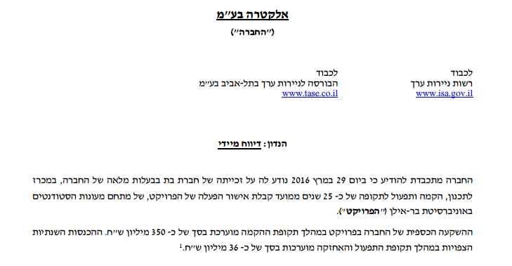 חברת בת בבעלות של אלקטרה בע"מ זכתה במכרז לתכנון, הקמה ותפעול, לתקופה של כ- 25 שנים של מתחם מעונות הסטודנטים באוניברסיטת בר-אילן.