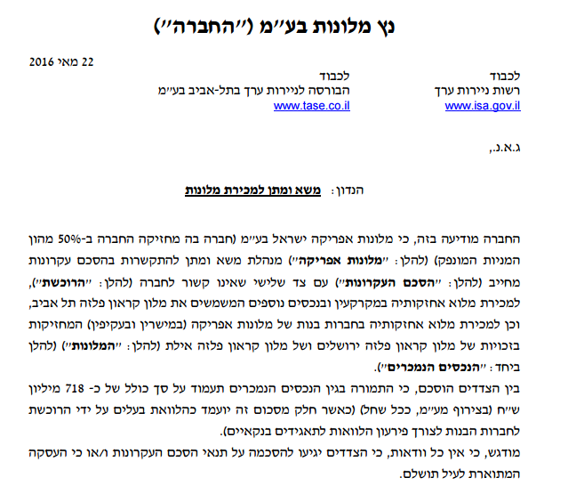 מלונות אפריקה ישראל בע"מ מנהלת מו"מ למכירת מספר מלונות בתל אביב, ירושלים ואילת תמורת 718 מיליון ₪.