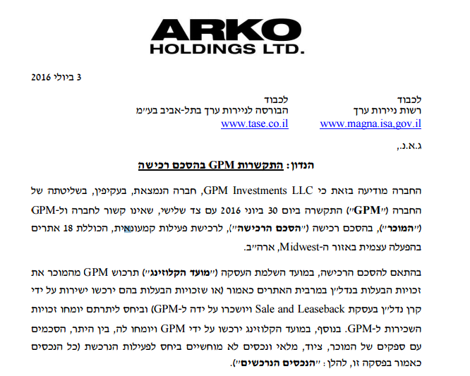 חברה בת של ארקו החזקות בע"מ התקשרה בהסכם לרכישת פעילות קמעונאית, הכוללת 18 אתרים בהפעלה עצמית באזור ה-Midwest ,ארה"ב תמורת כ 35 מיליון דולר.