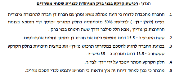 אשטרום נכסים בע"מ מנהלת מו"מ עם דן חברה לתחבורה ציבורית בע"מ לרכישת 50% מזכויותיה ב "מוסך דן" בבני ברק בשטח של כ – 15.5 דונם תמורת כ – 85 מיליון ש"ח.