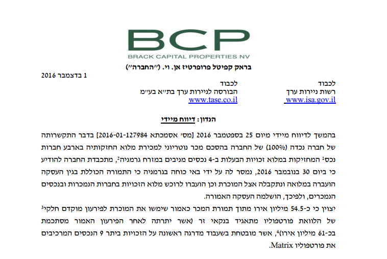 בראק קפיטל פרופרטיז אן.וי השלימה את מכירתם של ארבעה נכסים בגרמניה בתמורה לכ-67 מיליון יורו.