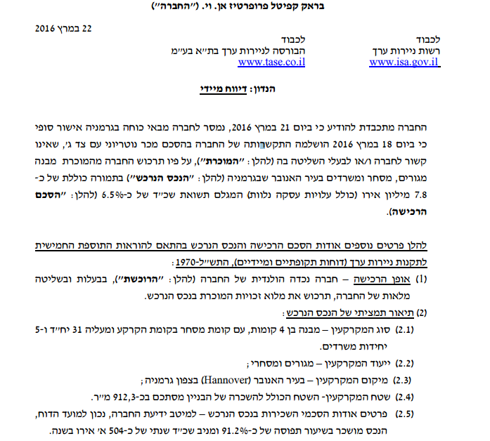 בראק קפיטל פרופרטיז אן וי השלימה עסקה לרכישת מבנה מגורים, מסחר ומשרדים בעיר האנובר בגרמניה תמורת כ 7.8 מיליון אירו.