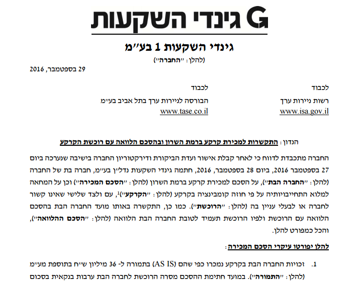 חברה בת של גינדי השקעות 1 בע"מ חתמה על הסכם למכירת קרקע ברמת השרון תמורת 36 מיליון ₪.