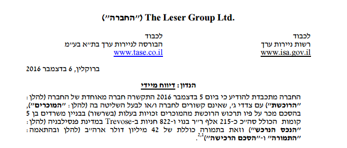 דה לסר גרופ לימיטד התקשרה בהסכם לרכישת בניין משרדים בפנסילבניה בתמורת כ-42 מיליון דולר.