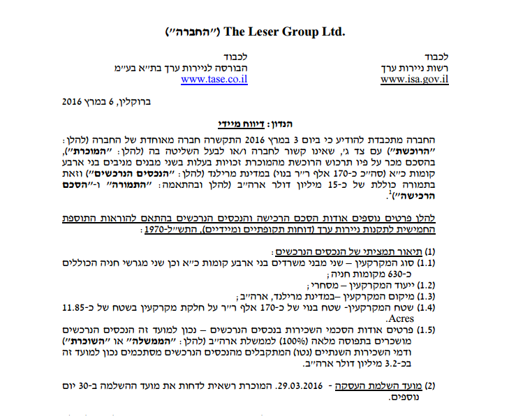 חברה מאוחדת של דה לסר גרופ לימיטד התקשרה בהסכם לרכישת זכויות הבעלות בשני מבני משרדים בני ארבע קומות כ"א וכן שני מגרשי חניה הכוללים כ-630 מקומות חניה, במרילנד, ארה"ב.