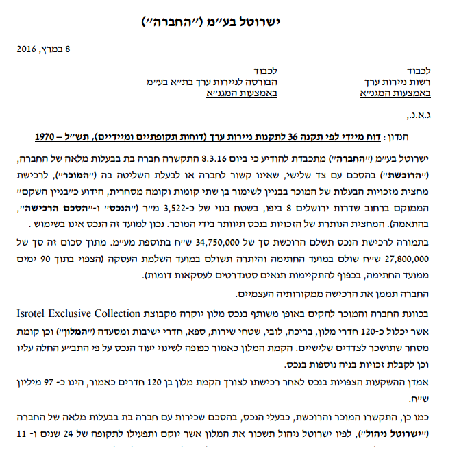 חברת בת של ישרוטל בע"מ התקשרה בהסכם לרכישת מחצית מזכויות הבעלות בבניין לשימור בן שתי קומות וקומה מסחרית, הידוע כ"בניין השקם" ברחוב שדרות ירושלים ביפו, בשטח בנוי של כ-3,522 מ"ר, תמורת 34,750,000 ₪.  בכוונת החברה והמוכר להקים יחד מלון יוקרה שיכלול 120 חדרים וקומת מסחר.