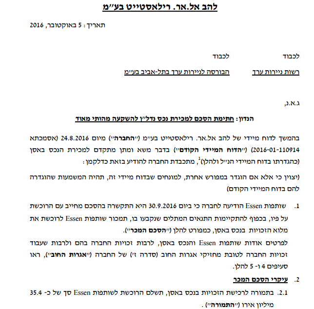 להב. אל.אר רילאסטייט התקשרה בקשר מחייב עם הרוכשת של בניין בבעלותה בגרמניה