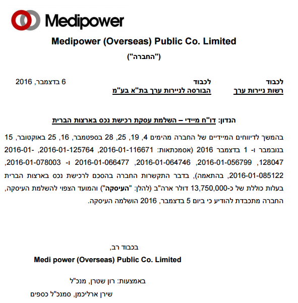 מדי פאור (אווורסיס) פאבליק קו לימיטדהשלימה רכישת נכס בארה"ב תמורת כ- 13,750,000 דולר ארה"ב.