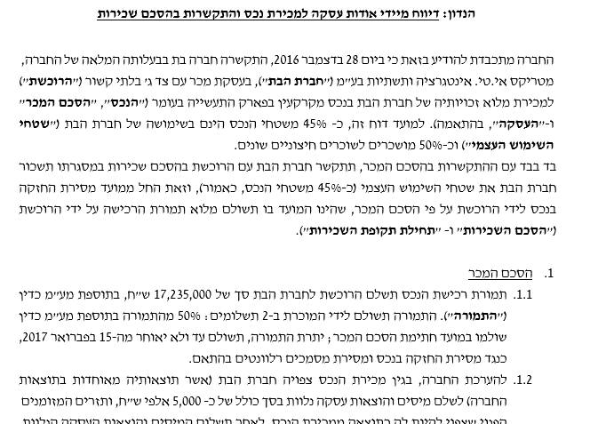 חברת מטריקס אי.טי. בע"מ התקשרה בעסקה למכירת נכס בעומר תמורת כ 17 מיליון ₪ ובמקביל התקשרה בהסכם לשכירות הנכס.