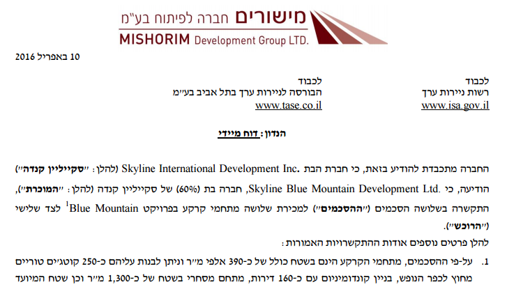 חברה בת של מישורים חברה לפיתוח בע"מ מכרה 3 חטיבות קרקע במתחם Blue Mountain בקנדה.