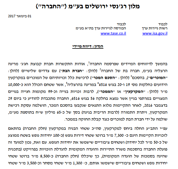 חברת בת של מלון רג'נסי ירושלים בע"מ השלימה עסקה לרכישת 10,000 מ"ר במרינה בהרצליה.