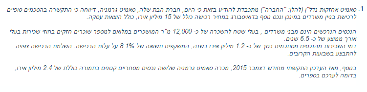 חברת בת של סאמיט אחזקות נדל"ן בע"מ, רכשה בניין משרדים במינכן ונכס נוסף בדואיסבורג, בשטח כולל של כ-12,000 מ"ר, בסך כולל של כ-15 מיליון אירו.