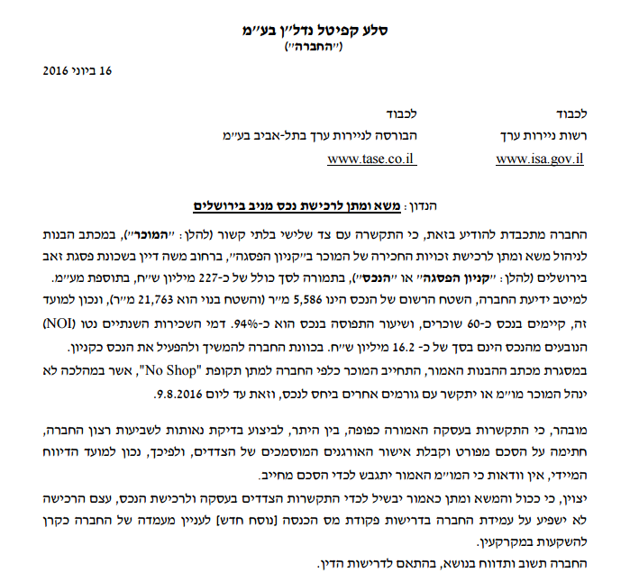 סלע קפיטל נדל"ן בע"מ מנהלת מו"מ לקניית קניון הפסגה בפסגת זאב ירושלים תמורת 227 מיליון ₪.