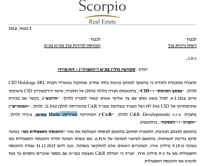 חברה בת של סקורפיו נדל"ן בע"מ מוכרת את פרויקט Harfa בפראג.