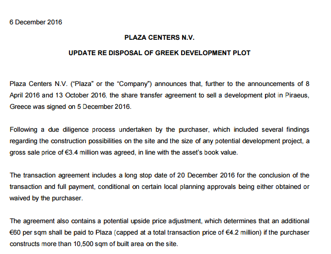 פלאזה סנטרס אן.וי השלימה מכירת נכס ביוון בתמורת כ- 3.4 מיליון אירו.
