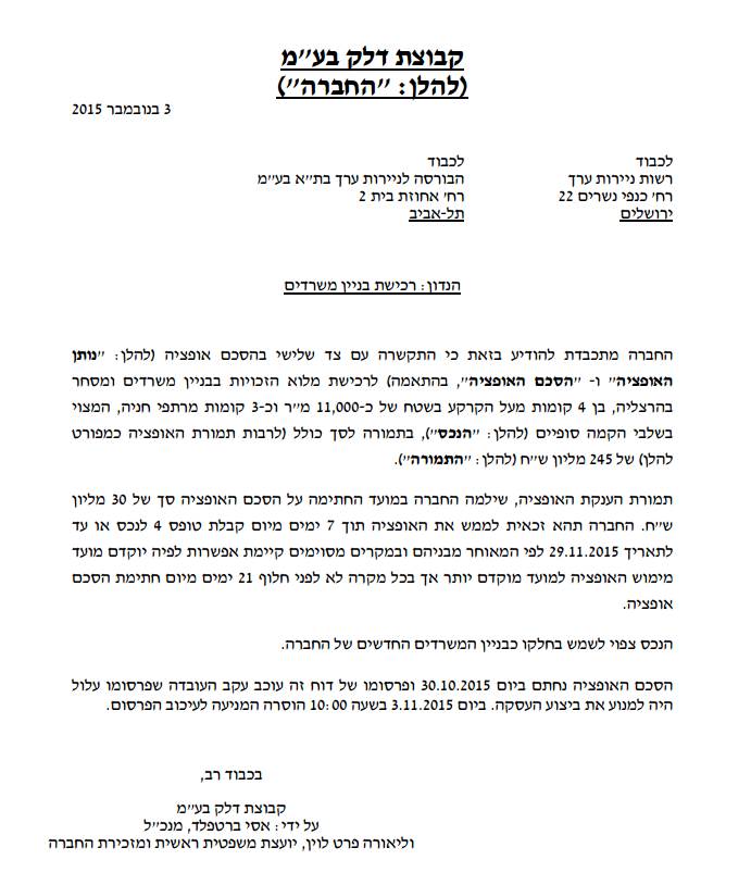קבוצת דלק בע"מ התקשרה בהסכם אופציה לרכישת מלוא הזכויות בבניין משרדים ומסחר בן 4 קומות בהרצליה, בשטח של כ-11,000 מ"ר וכ-3 קומות מרתפי חניה, תמורת 245 מיליון ₪ (לדיווח החברה).