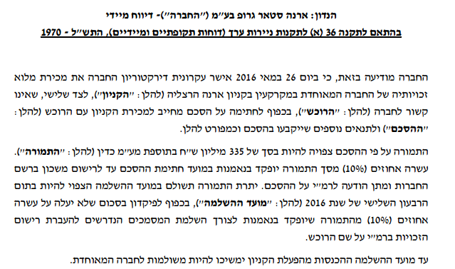 ארנה סטאר גרופ בע"מ התקשרה בהסכם, כפוף להתניות, למכירת קניון ארנה בהרצליה תמורת 335 מיליון ₪.