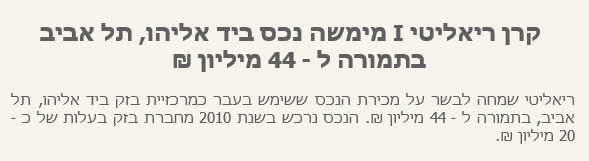קרן ריאליטי מכרה נכס ביד אליהו, תל אביב, היושב על שטח של כ-3.5 דונם, בסך של כ-44 מיליון ש"ח.