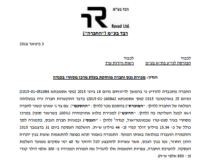 חברה בת של רבד בע"מ השלימה את מכירתו של מרכז מסחרי בעיר סנט-טרז במונטריאול, קנדה בתמורה ל-כ 15.54 מיליון דולר קנדי.