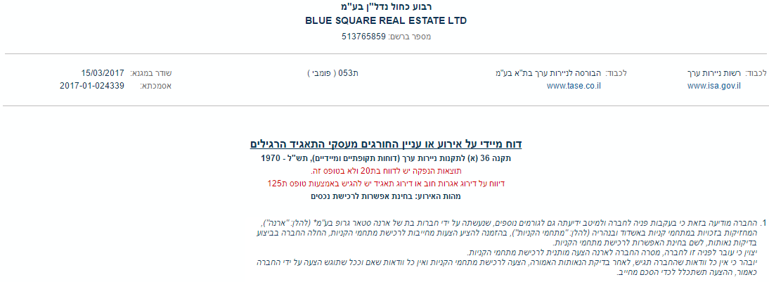 ריבוע כחול נדל"ן בע"מ מבצעת בדיקות נאותות בכוונה לבחון רכישת הקניונים סטאר סנטר באשדוד וארנה בנהריה מארנה סטאר גרופ בע"מ.