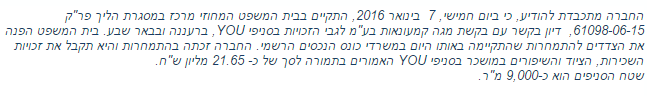רשת חנויות רמי לוי שיווק השיקמה 2006 בע"מ תקבל את זכויות השכירות, הציוד והשיפורים במושכר בסניפי YOU ברעננה ובבאר-שבע.
