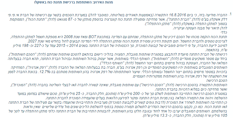 רפק תקשורת ותשתיות בע"מ רוכשת, כחלק מקבוצת הרכישה, את תחנת הכוח באשקלון, תשלם בתמורה לחלקה כ- 25 מיליון ₪ .