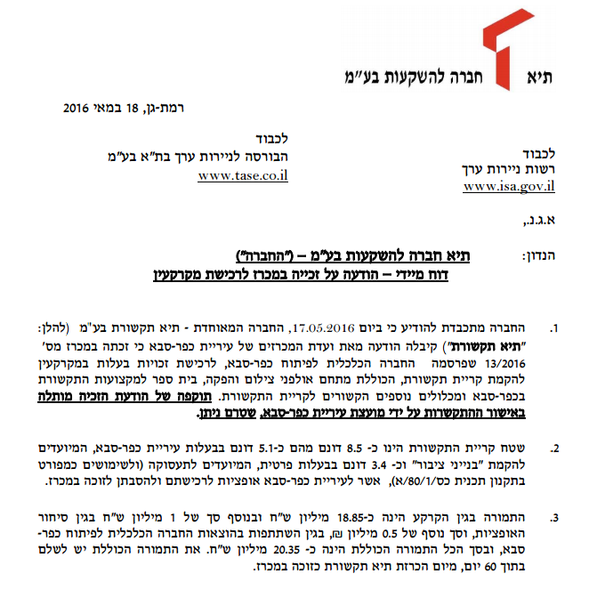 תיא זכתה במכרז מקרקעין בכפר סבא